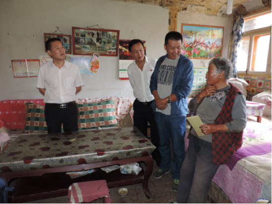 朝物開投公司副總經理喇軍民、物產汽貿公司董事長張建軍、機電市場公司市場部部長王功明以"三幫一"的方式結對幫扶絕對困難戶楊生福。楊生福,男,藏族,61歲,家中三口人,本人肢體四級殘疾,妻子四級殘疾(羅鍋),兒子30歲,現安排在當地從事護林員工作,未結婚,住房為土木結構,此次結對幫扶為其送去了600元慰問金。