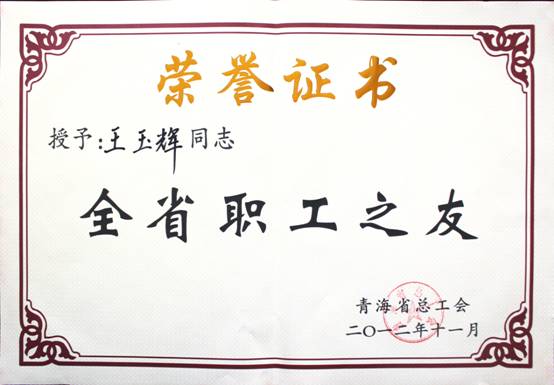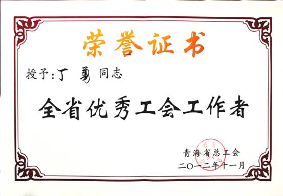 在2012年11月23日召開的青海省工會第13次代表大會上,省總工會對全省優秀個人、模范集體進行了表彰。集團總經理王玉輝同志榮獲"全省職工之友"榮譽稱號;青海物產物資配送有限責任公司工會榮獲"全省模范職工之家"榮譽稱號;馬軍同志榮獲"全省優秀工會積極分子"榮譽稱號;丁勇同志榮獲"全省優秀工會工作者"榮譽稱號。